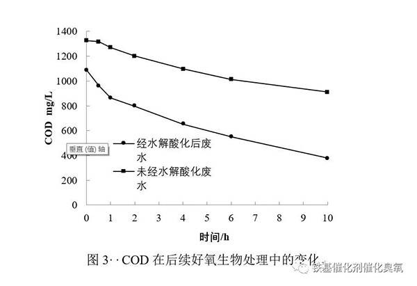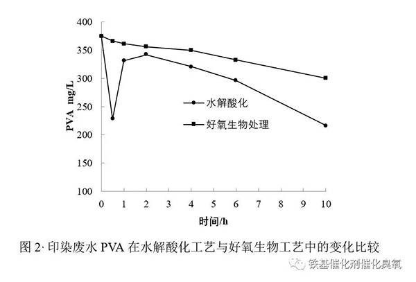 對(duì)于一些高聚物,在水解酸化段比在好氧生物段,“水解”作用進(jìn)行得更充分,即“大分子變?yōu)樾》肿印?,由此可生化性提高。如我們的研究,水解酸化處理?shí)際印染廢水中的PVA(聚乙烯醇),對(duì)降低聚合度有顯著的作用,如圖1;而好氧生物處理工藝對(duì)PVA的降解,明顯弱于水解酸化過程,如圖2;經(jīng)過水解酸化預(yù)處理后,好氧生物處理去除有機(jī)物的效果明顯提高。